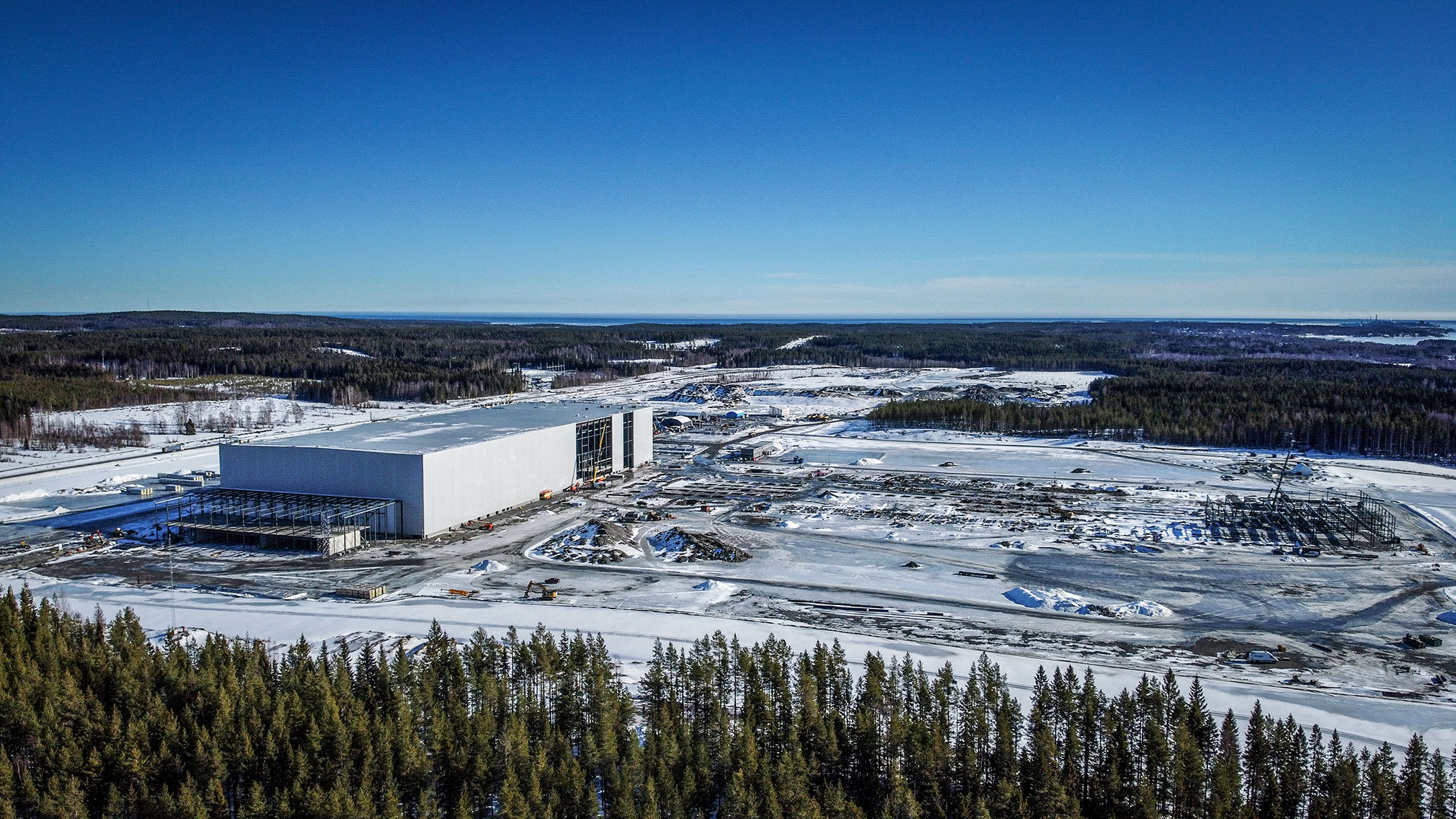 Bergsbyns industriområde ligger på mark som tills nyligen var skog. På ett ändlöst, bländvitt fält myllrar byggnadsarbetare som myror runt en plåtkoloss: Upstream. Fabriksområdets första och största byggnad, 35 meter hög, 120 bred och 250 lång. Lastmaskiner och pickuper inne i den skuggiga salen ser ut som kvarglömda leksaker. En bit bort står stommen till nästa hus, som också blir enormt. Solen studsar mot snön, får ögonen att tåras och värka; vana besökare har mörka brillor. Smältvattnet skvalar från takets kanter. En projektledare, Emma Sundelin, Northvolts pressansvarige Anders Thor, och Malin Fuglesang visar mig runt.