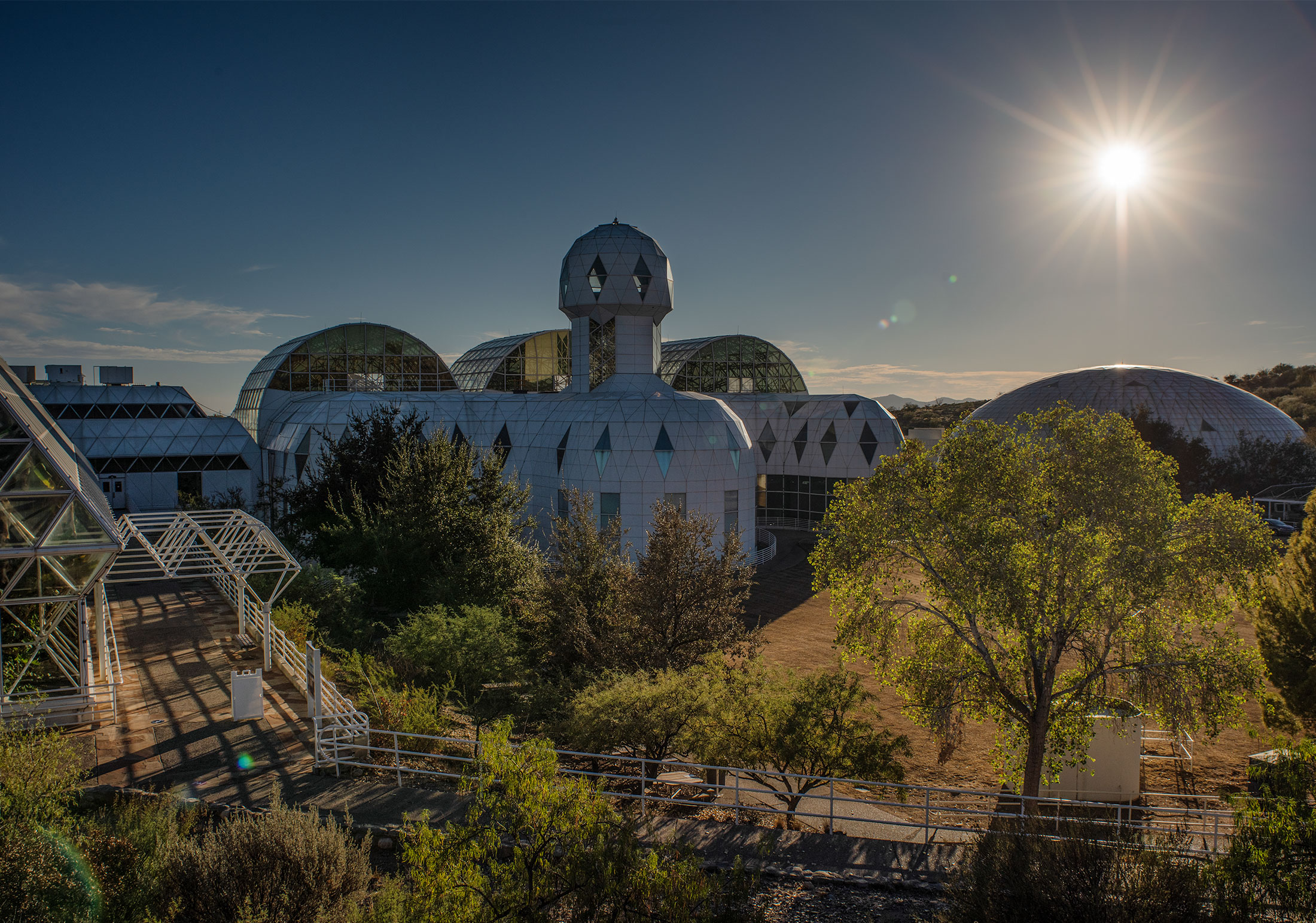 En stekhet förmiddag i oktober 2020 kör vi på en dammig grusväg i Sonoraöknen i Arizona, förbi kaktusar, torra buskar och taggtrådsstängsel, med de blågrå Santa Catalina-bergen i horisonten. Mitt ute i ingenstans tornar Biosphere 2-komplexet upp sig, som futuristiska mayapyramider i glas. De är så sprängfyllda med växtlighet att plantor och blad klättrar längs med fasaderna, som om de försökte pressa sig ut.