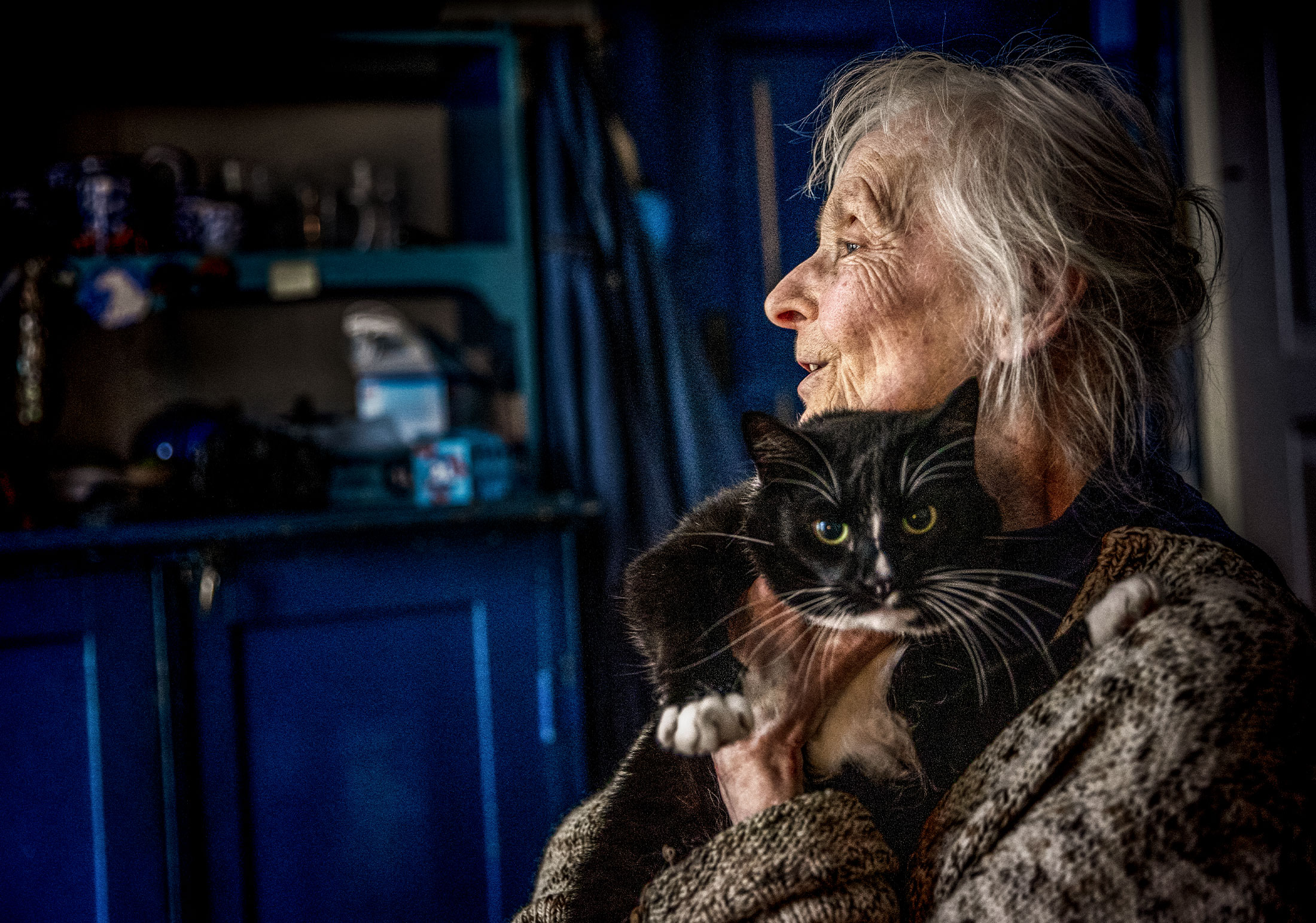 I varm kofta, yllesockor och med en mystisk medaljong från 1700-talet runt halsen tar hon emot oss med utsträckta armar och klarblå blick. Sedan skuffar hon in oss genom dörren, in i köket.