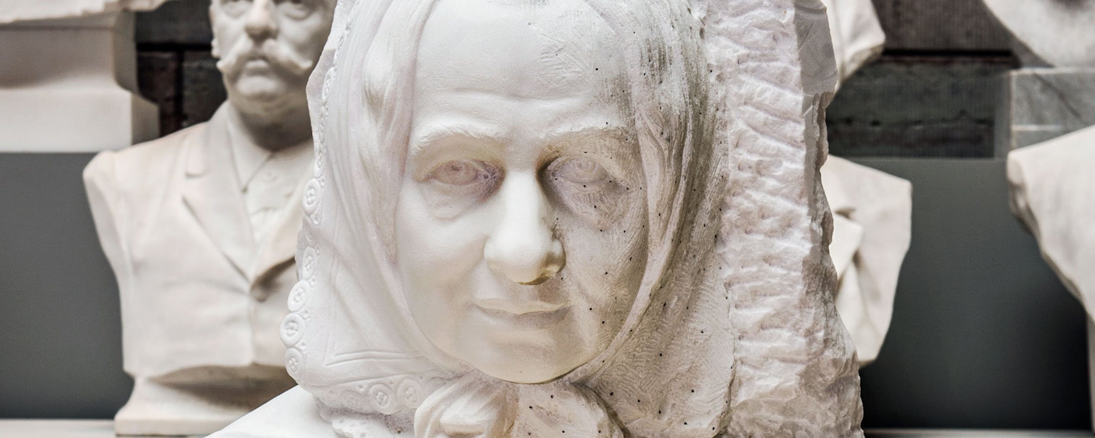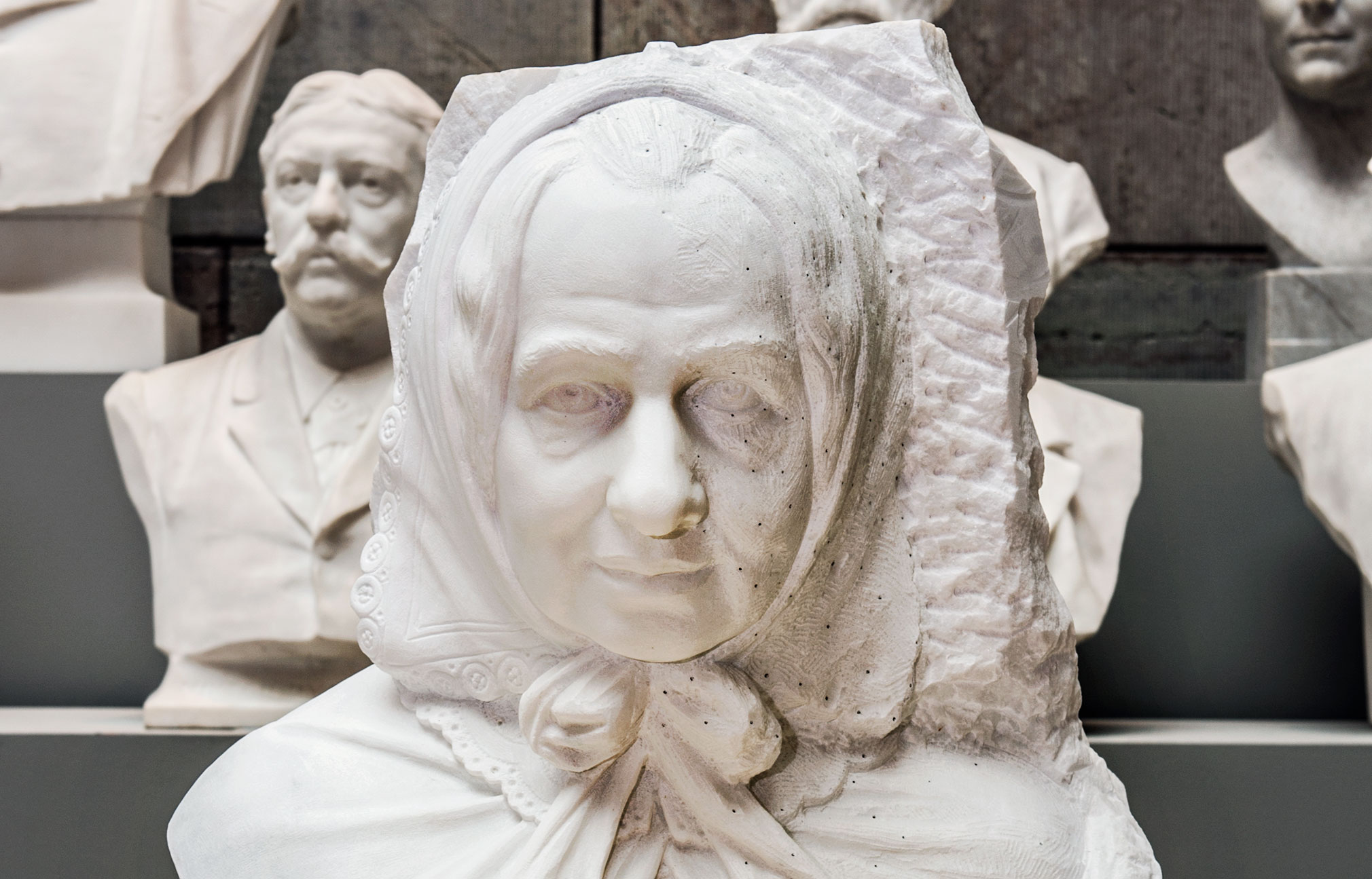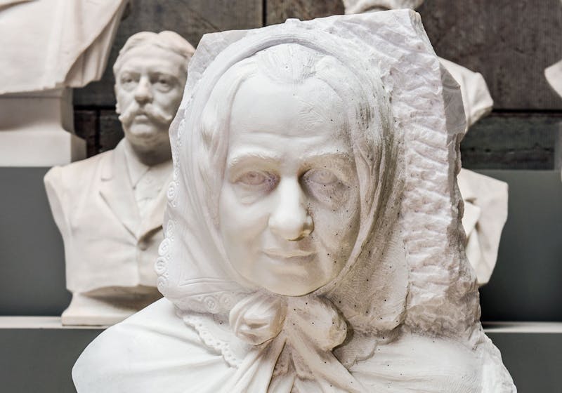 Carl Gustaf Qvarnström påbörjade 1866 en porträttbyst av Fredrika Bremer. Skupturen blev dock (typiskt nog?) inte färdigställd förrän i fjol. // Foto: Linn Ahlgren/Nationalmuseum