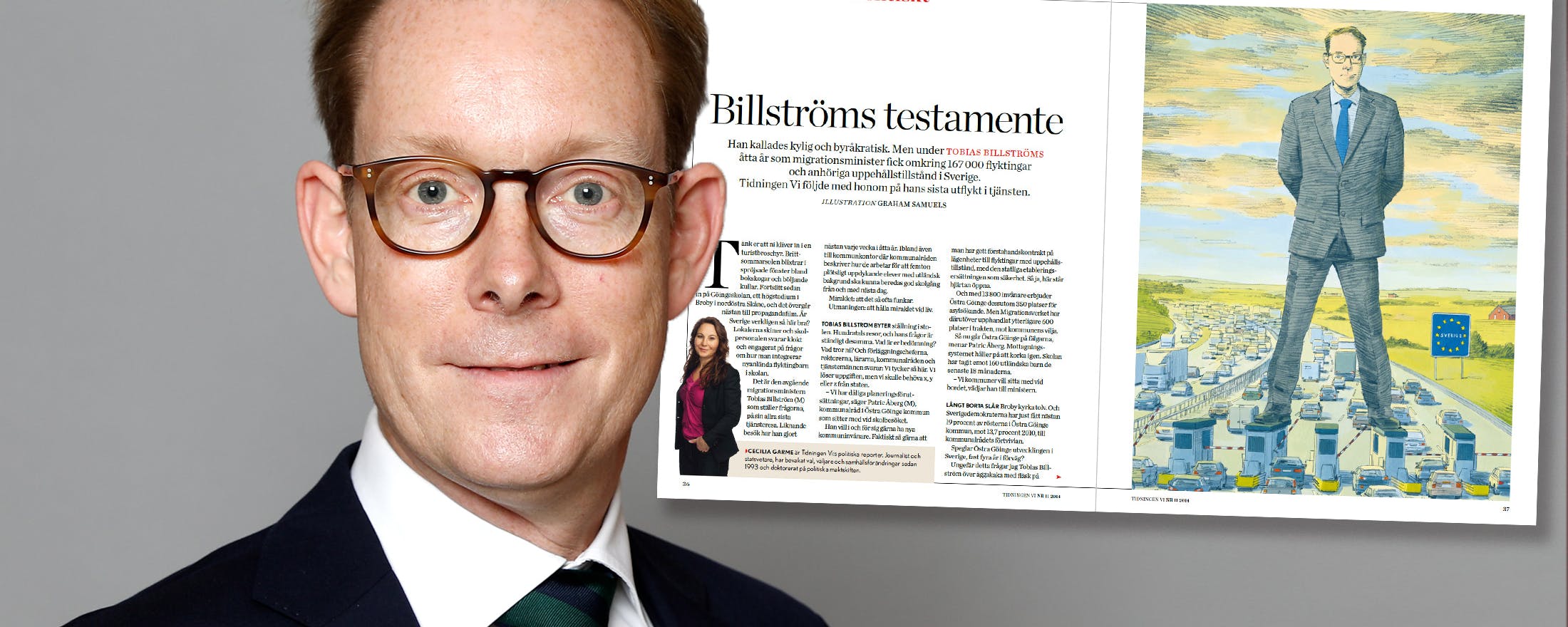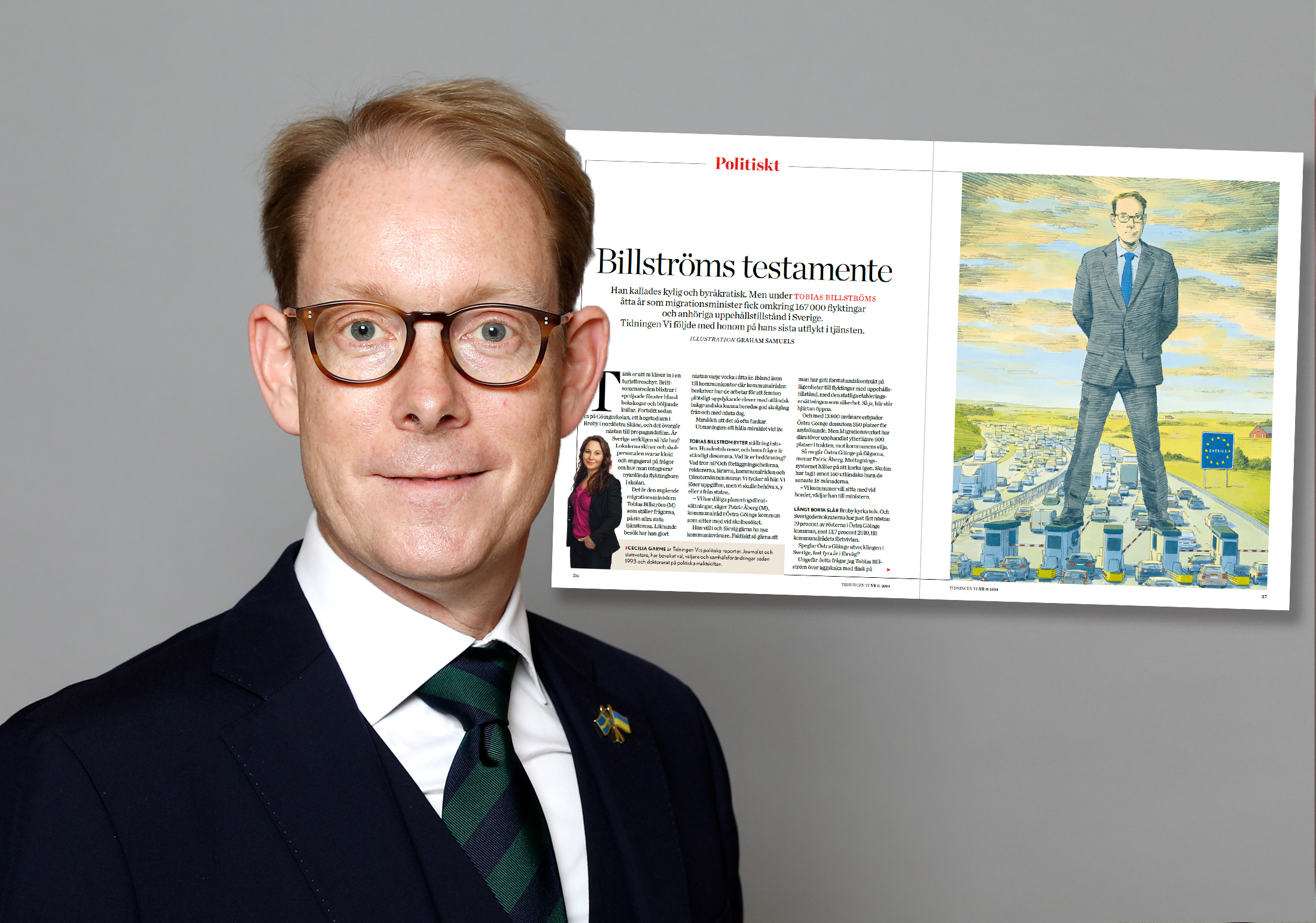 2014 publicerade Tidningen Vi en illustration, föreställande en stor men vänlig Tobias Billström vid en gränskontroll. Nu, när Billström blivit utrikesminister, används bilden i rakt motsatt syfte. ”Det här kan skada min karriär”, säger illustratören Graham Samuels.