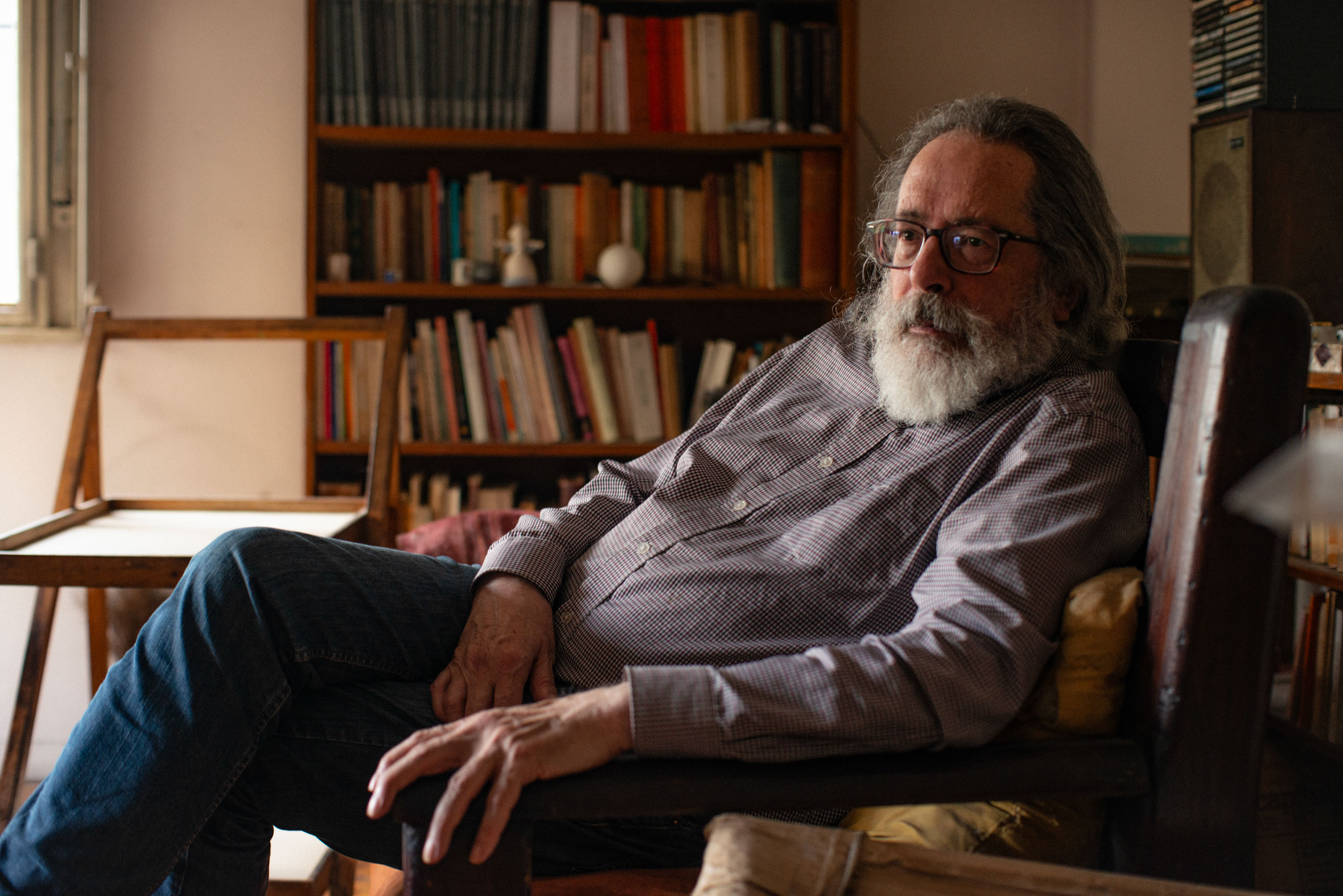 Han kryssar vant mellan bokhögarna till ett av de tidigare barnrummen, med en bekväm gamer-stol framför datorn och ett rött överkast som skymtar mellan böckerna på sängen. Väggarna är blåmålade, till skillnad från i resten av lägenheten där de och taket har en gråaktig färg som bara decennier av familjeliv kan skapa. Båda barnen hade flugit ut sedan länge när han och hustrun, poeten Liliana Ponce, blev tvungna att flytta till en bostad med hiss för två år sedan då hon blev rullstolsburen. Det mesta av sin tid ägnar han åt hushållssysslor och åt att sköta om henne. Maten köper han färdig och mikrar.