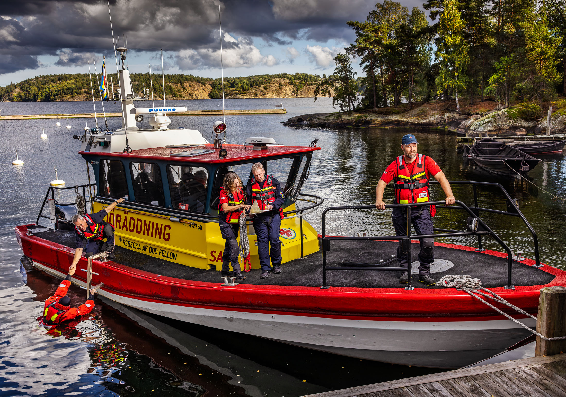 Vi kan gå från superlugnt till skarpt läge på tio sekunder. När vi ligger inne i hamn är det mycket skoj och prat. Vi dricker kaffe, käkar kakor och garvar. Sedan kommer ett larm och då är det omedelbart fullt fokus och alla koncentrerar sig på uppdraget. Samtidigt som vi kör pratar vi om vad som kommer att möta oss där ute. Ska vi ta fram filtar och sjukvårdsväska? Borde vi larma efter ytterligare en båt? Vi förbereder oss på det allra värsta, att människor ligger skadade i vattnet, och har med all tänkbar utrustning – bogsertampar, brandpump, sjukvårdsväska, bårar, syrgas och kommunikationsradio. Torrdräkterna är alltid nära till hands, de åker ofta på.