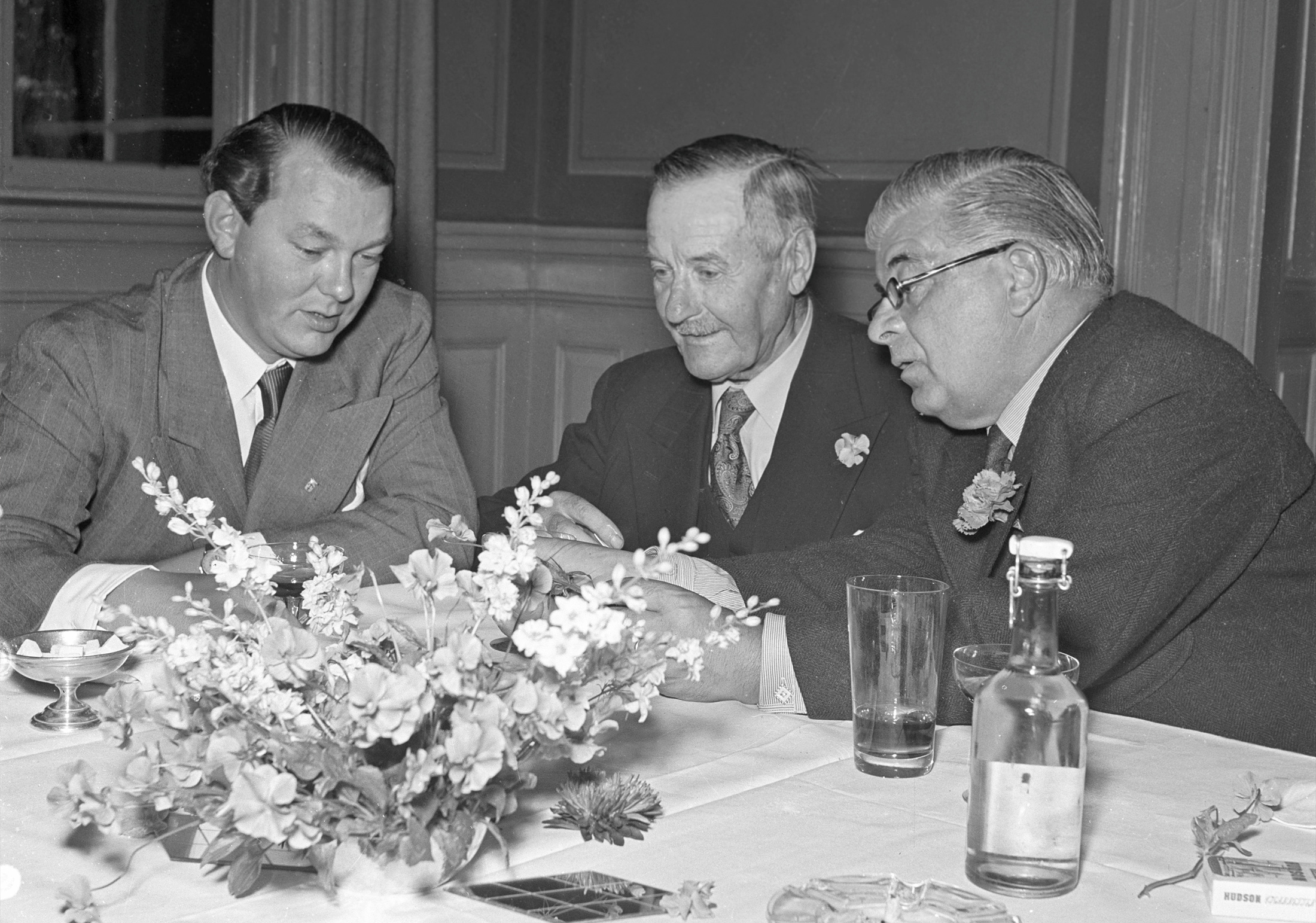Åke Grönberg, Carl von Schewen och Evert Taube på premiären av filmen ”I Roslagens famn”, 1945. // Foto: K-G Kristoffersson